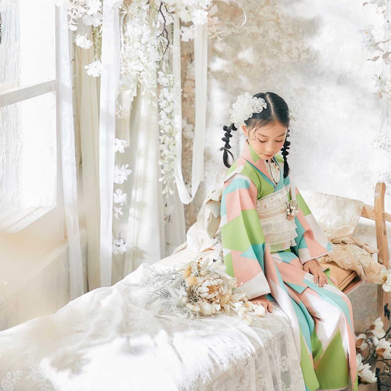 大きな三角形を組み合わせた幾何学模様が目を引くデザインのきものです。