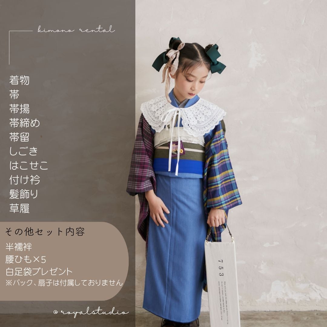 着物のベースは明るめのブルー無地に赤紫×ブルーのチェック柄の袖が印象的。