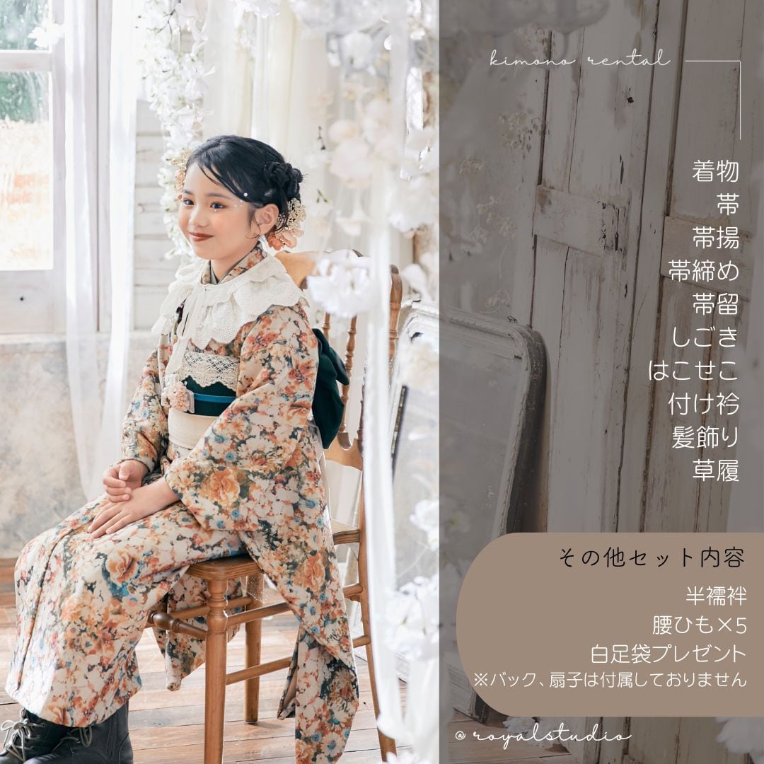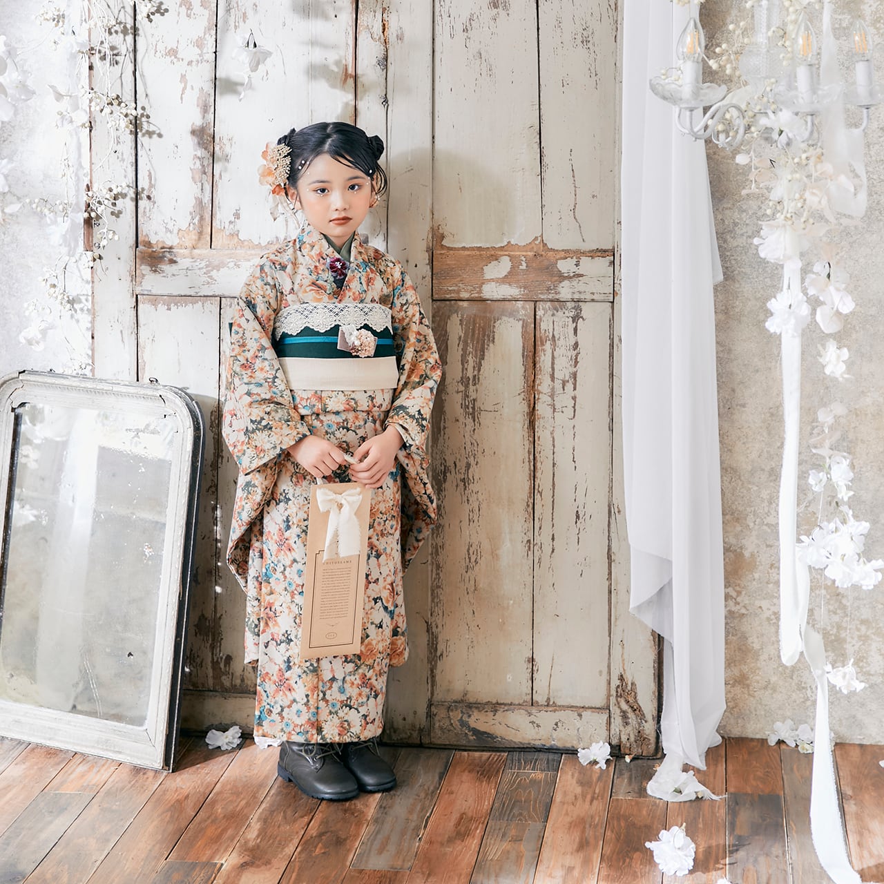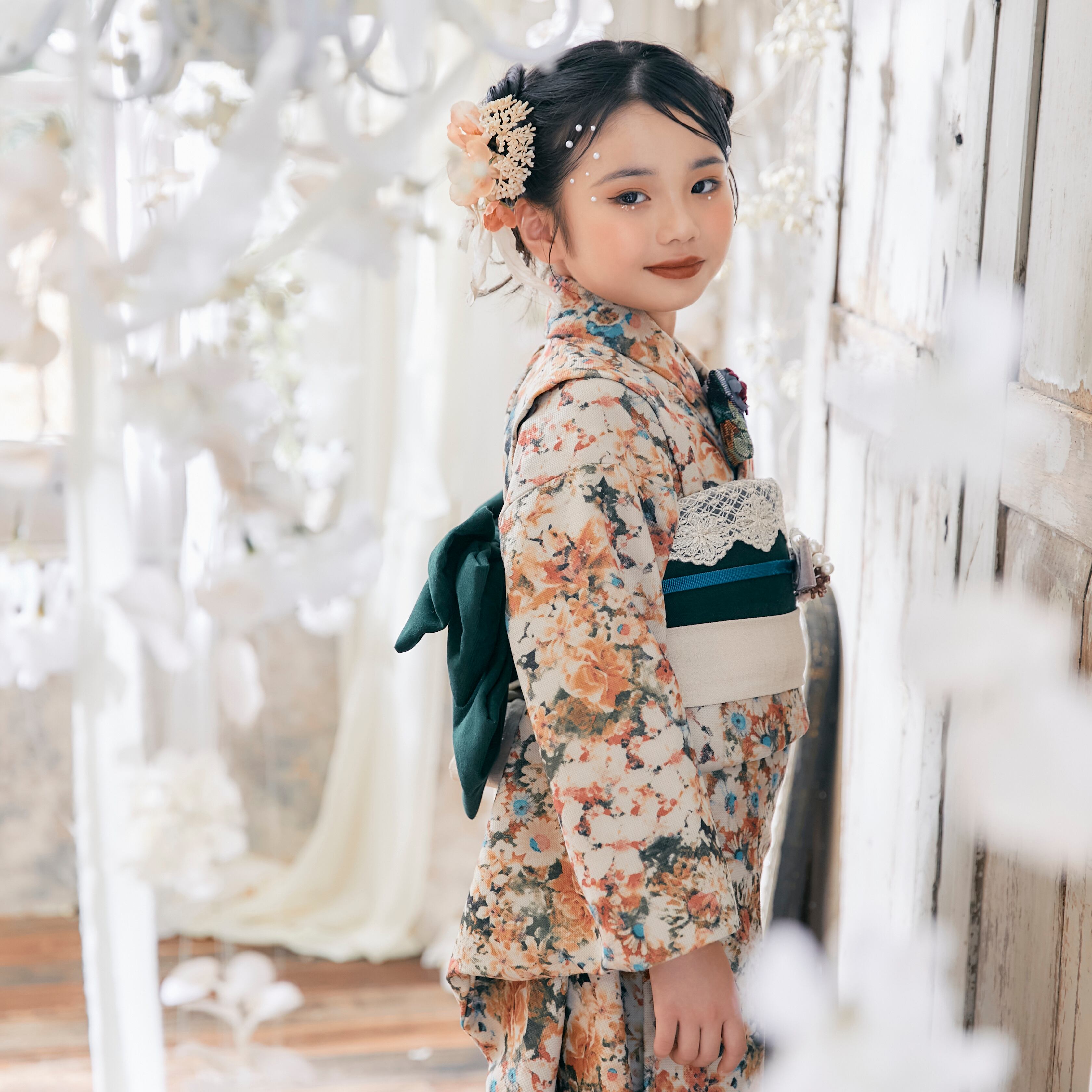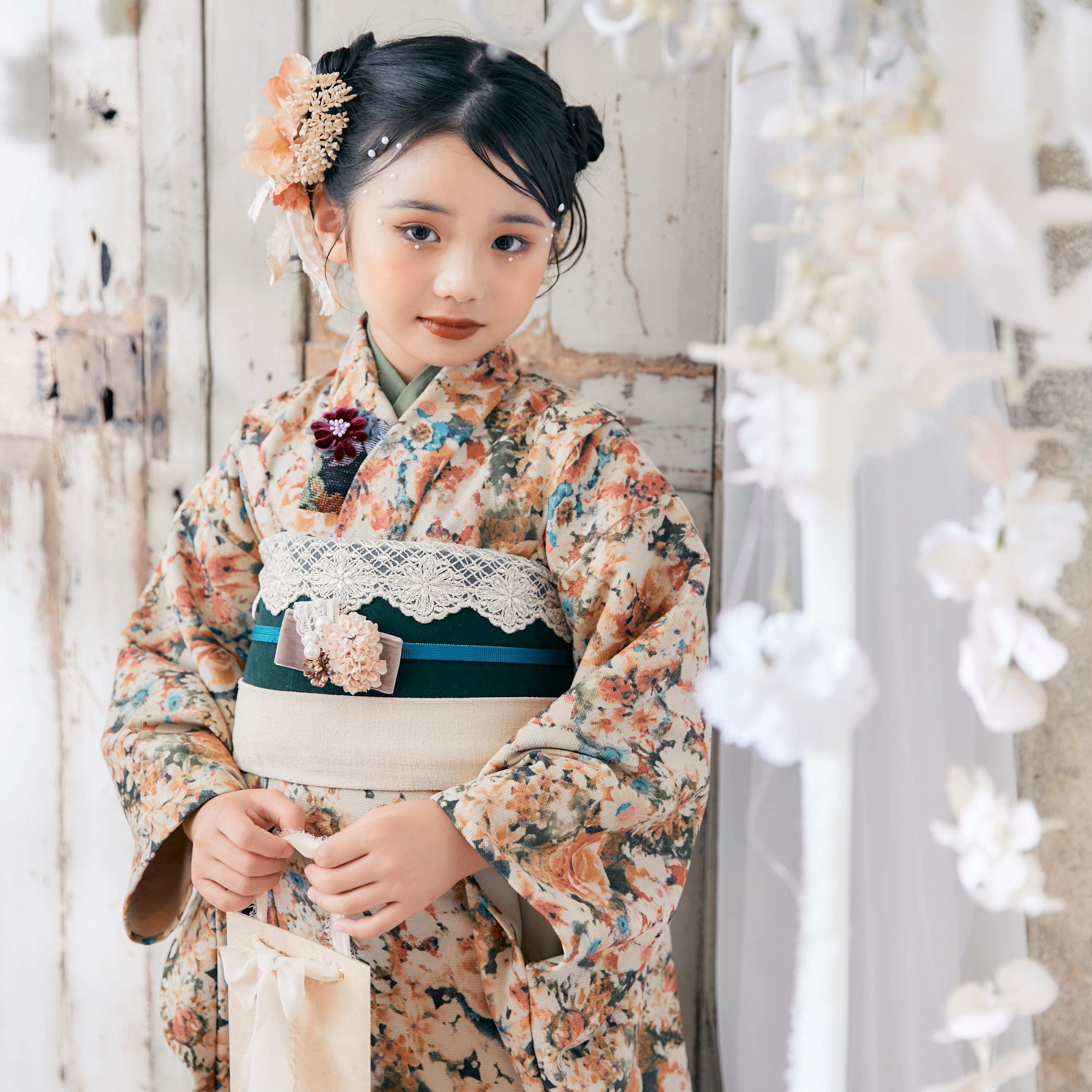 帯は深緑のベルベット生地、レースの帯揚やベージュのしごき、ベルベットリボンの帯留めで和と洋が融合した上品かつモダンなコーディネートに仕上げました。