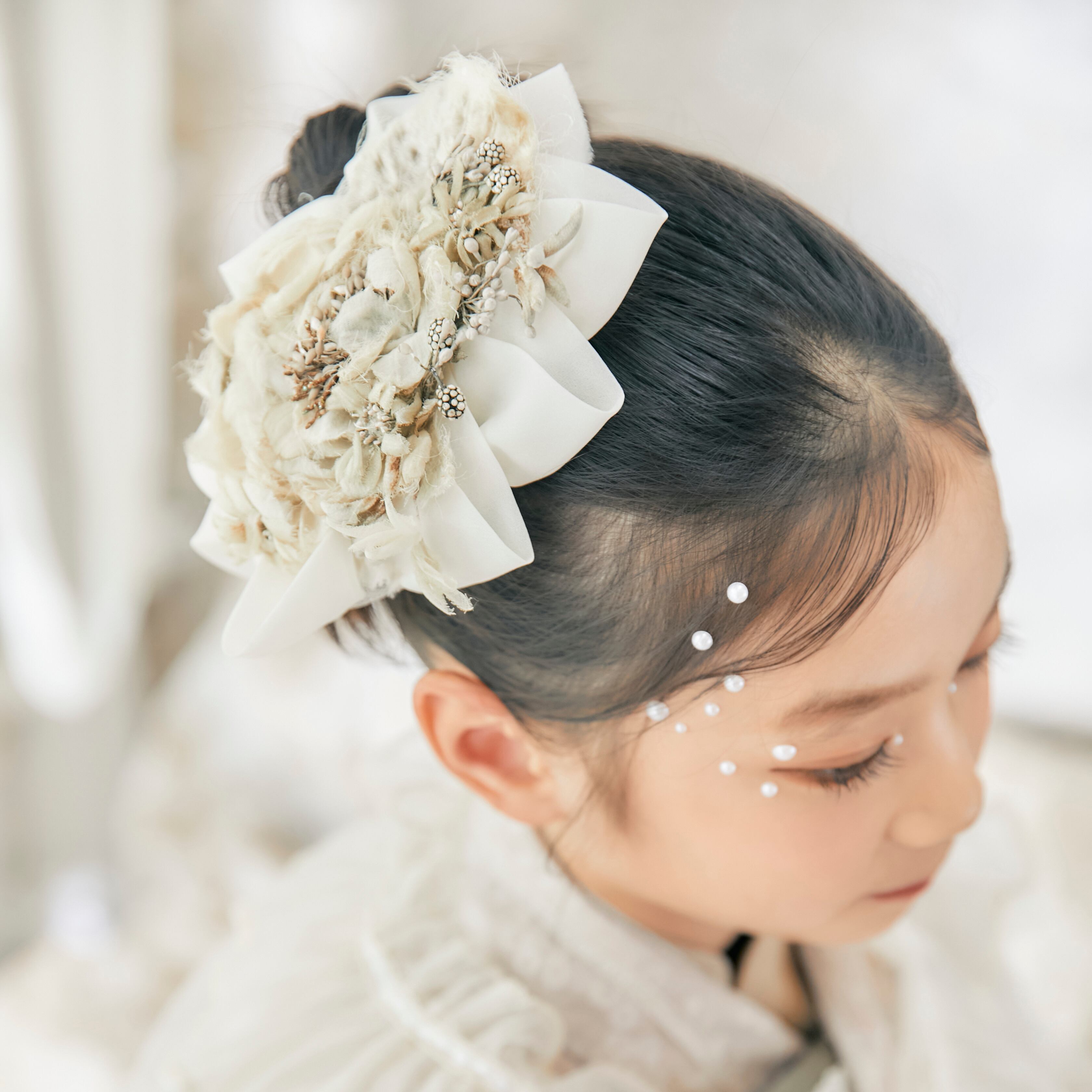 髪飾りは白系のボンネハットが上品さと華やかさをプラス。