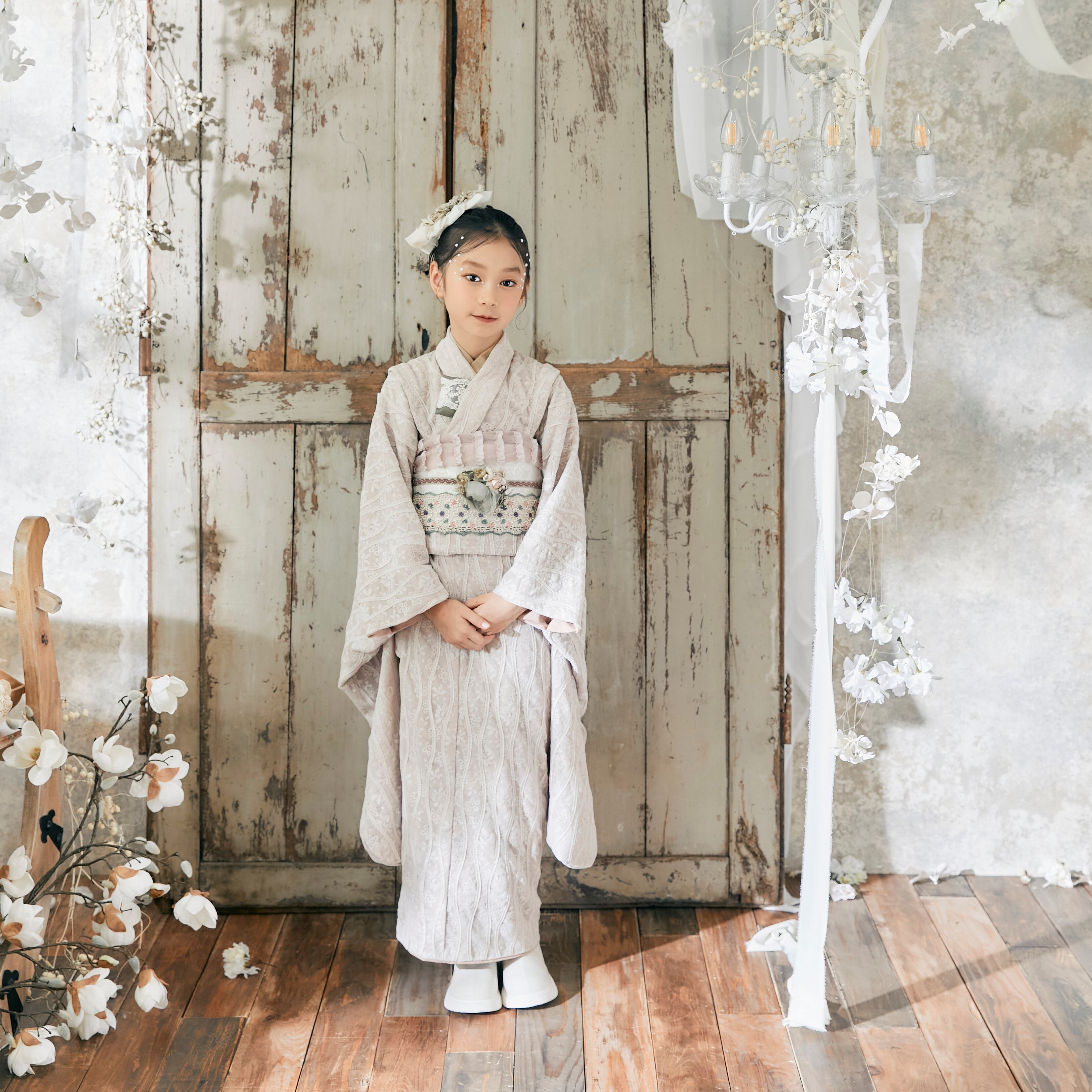 立体感のあるレースきものをワントーン小物でコーディネート。