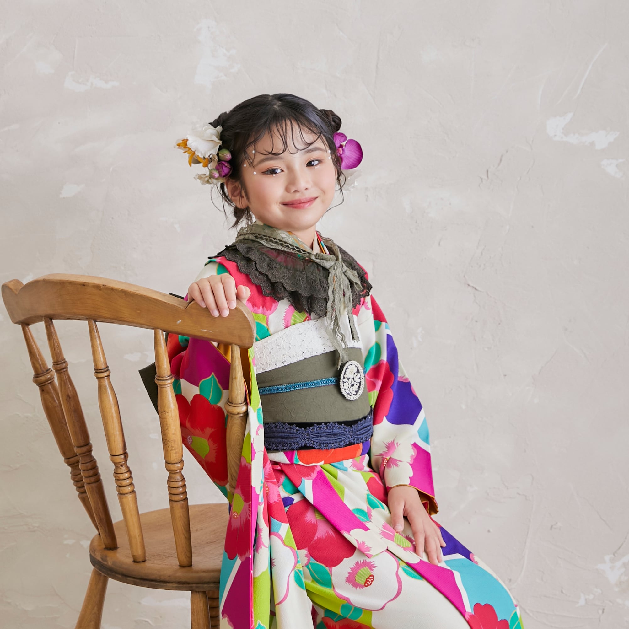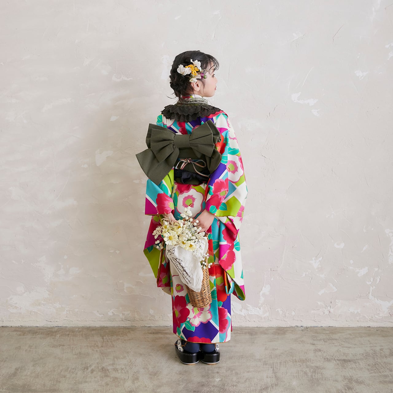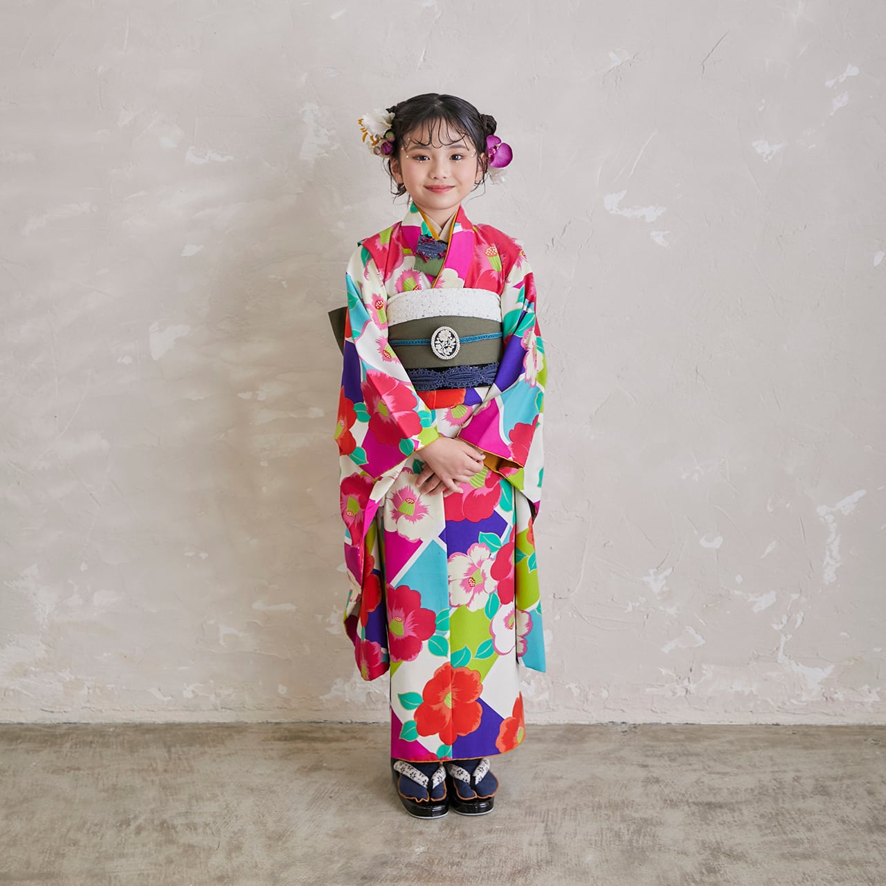 鮮やかなピンク・赤・水色・ライムグリーンの幾何学模様と椿の大胆なデザインの着物です。