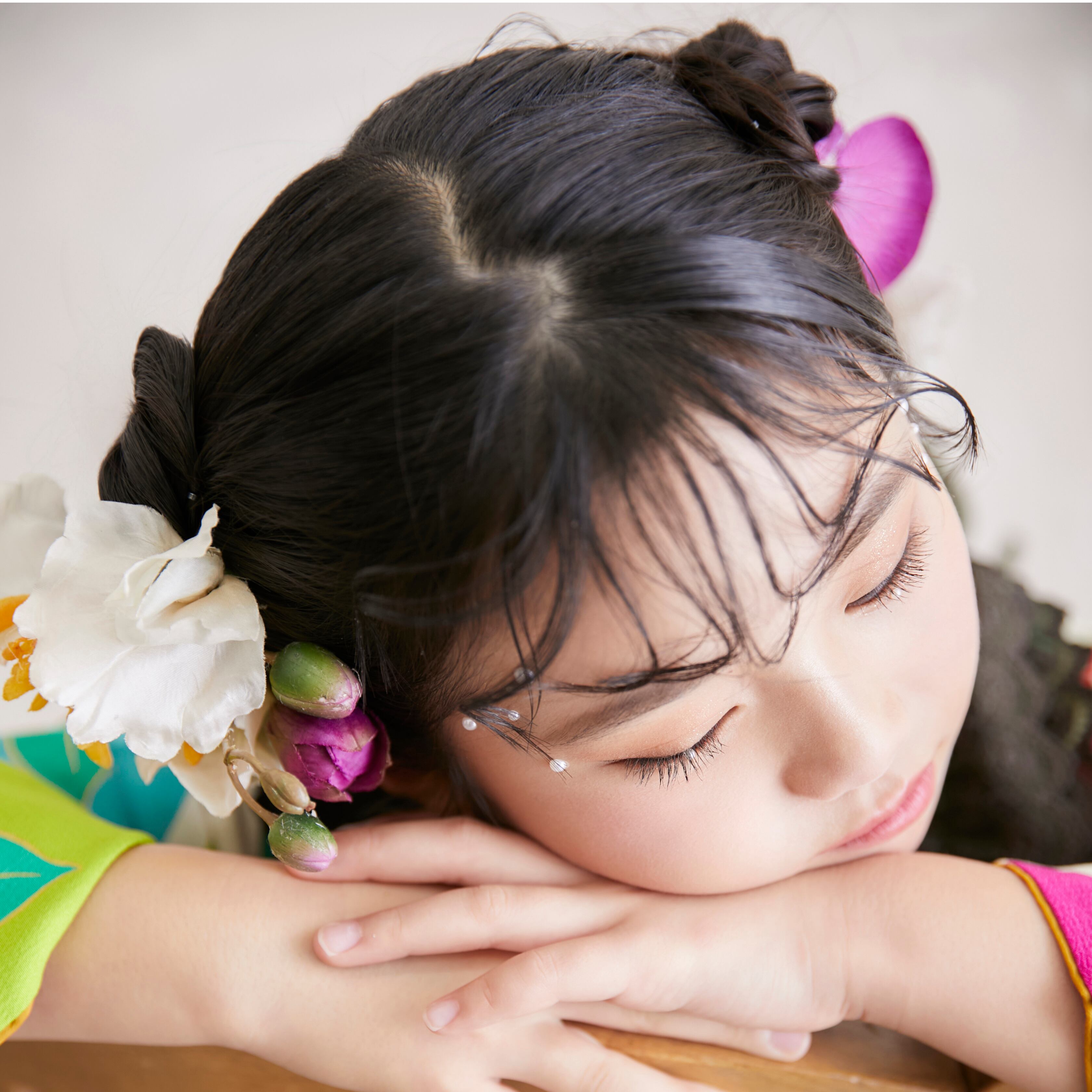 髪飾りはカラフルなアーティフィシャルフラワーを複数本お届けします。