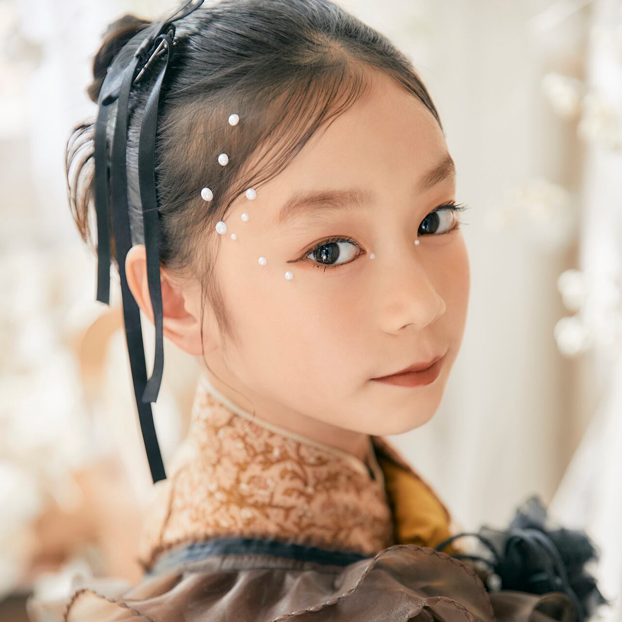 ブラウンのサッシュベルト風の付け衿。黒リボンのヘッドアクセサリーで上品な可愛らしさを演出します。