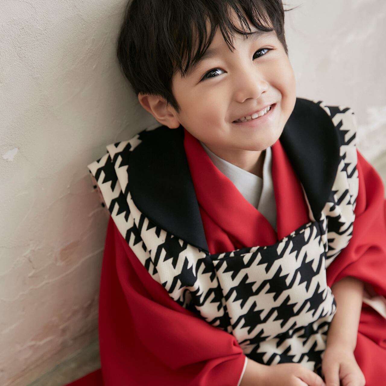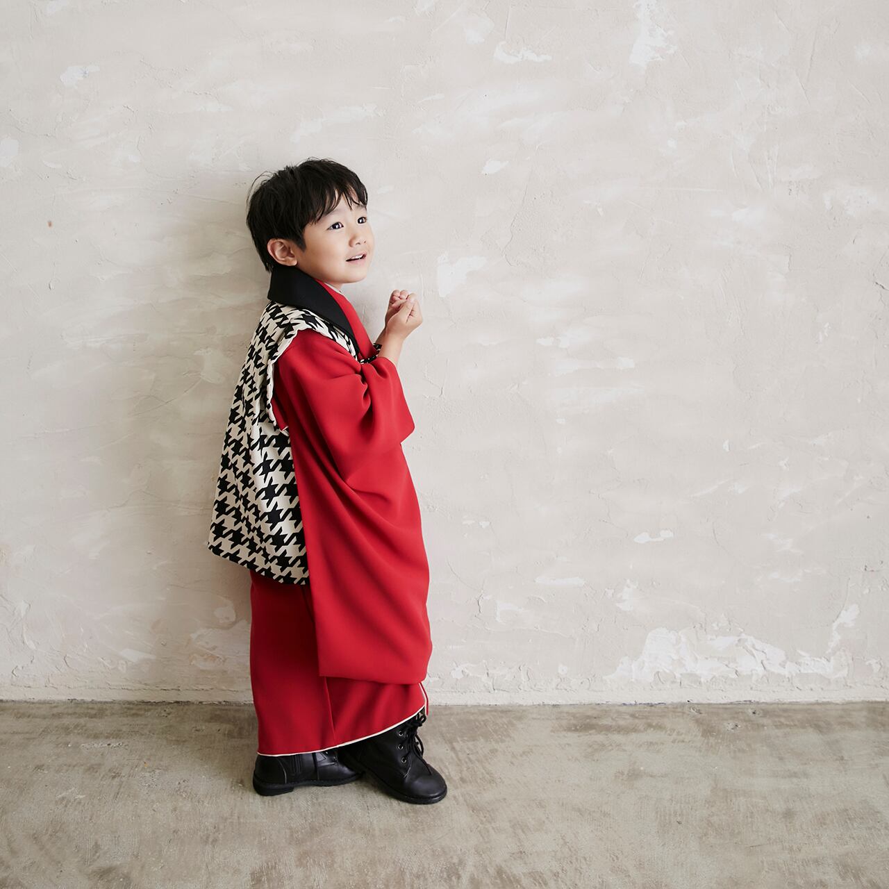 鮮やかな真紅の無地着物をベースに大胆な千鳥格子柄の被布コートをプラス。