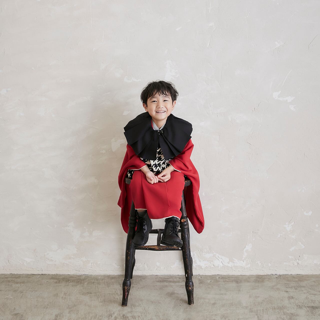 襟元には黒のプリーツケープでクラシカルで遊び心のあるコーディネートです。