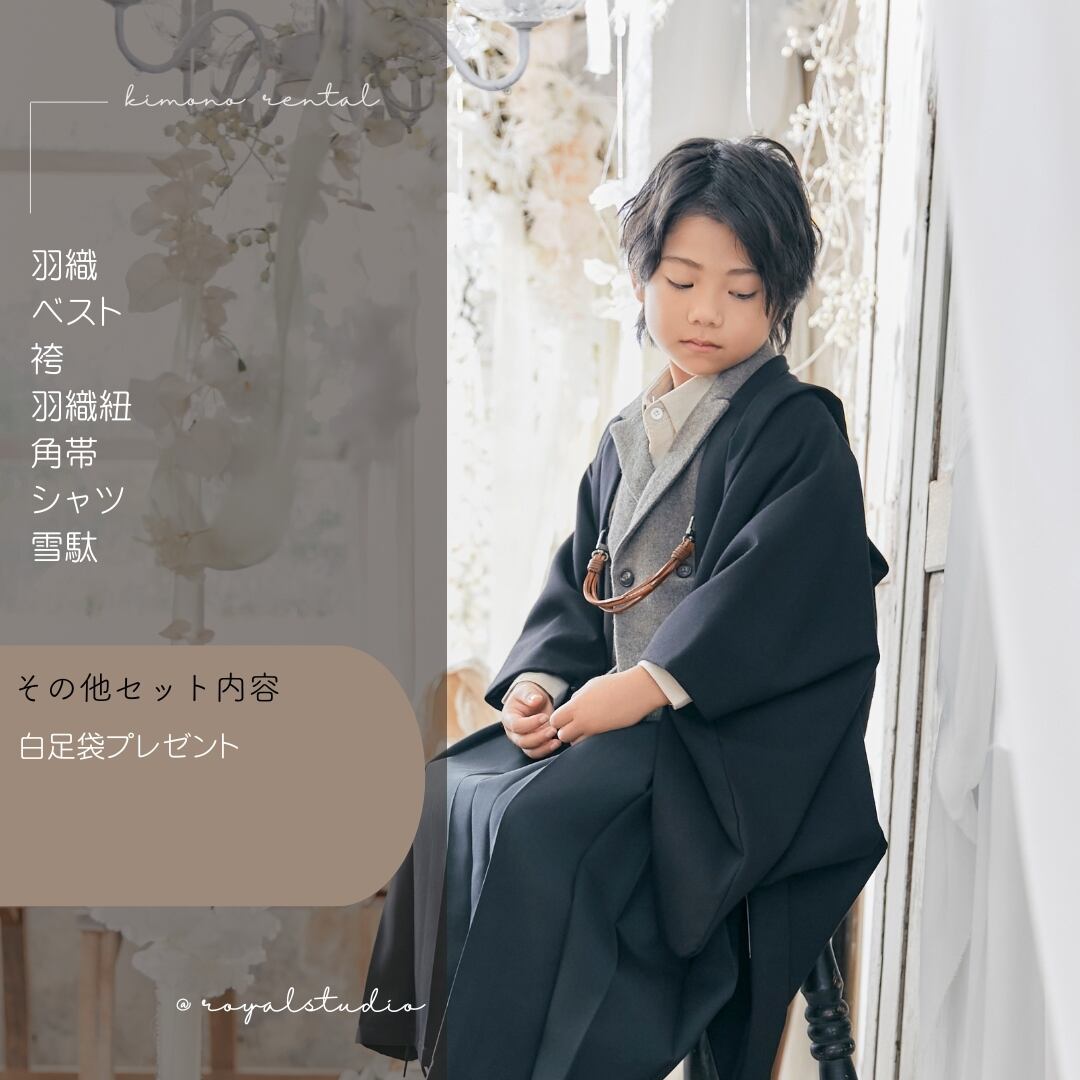 ベージュシャツ×グレージュダブルベストにブラックの袴。