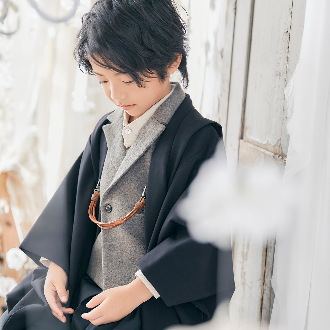 袴と同じ生地で仕立てた羽織はロングコートのイメージで、通常よりもロング丈に仕立てています。全体的に落ち着いた色味でトーンを揃え、スマートにまとめました。