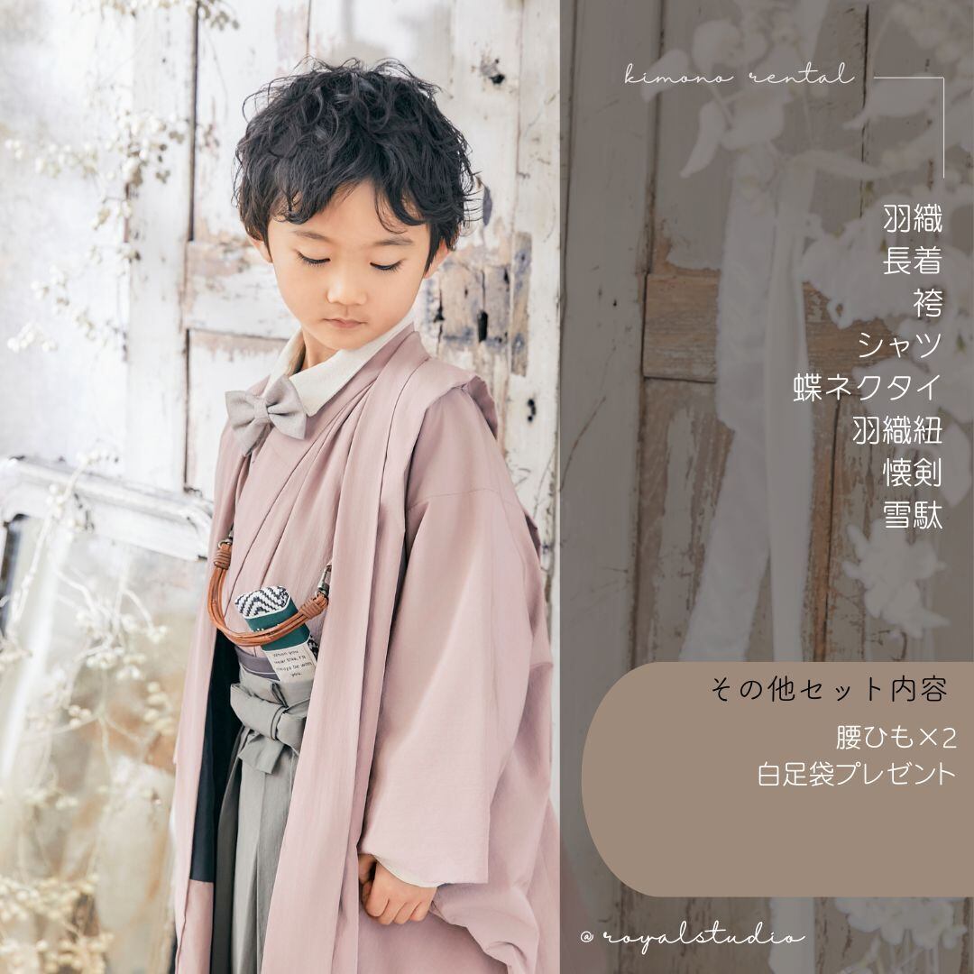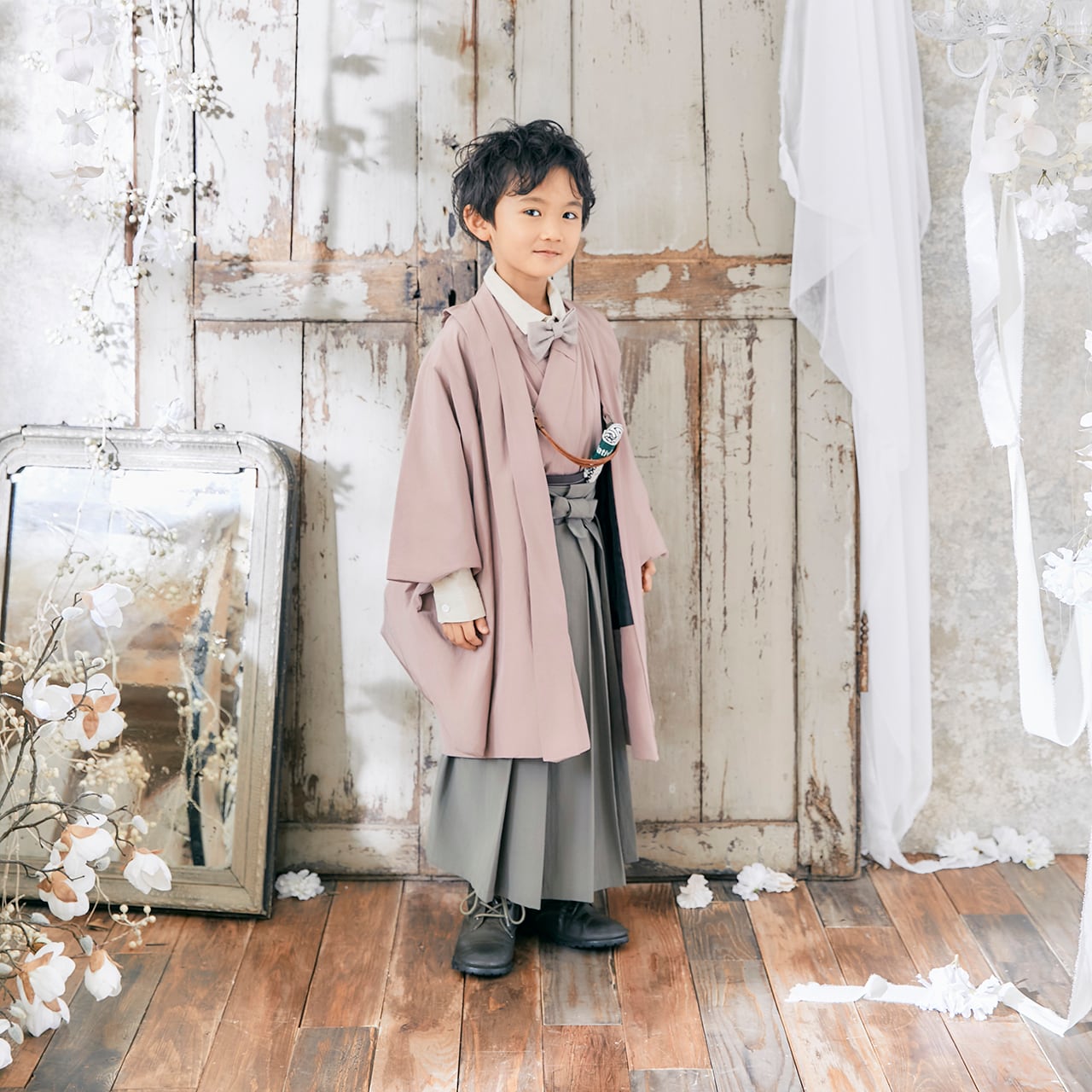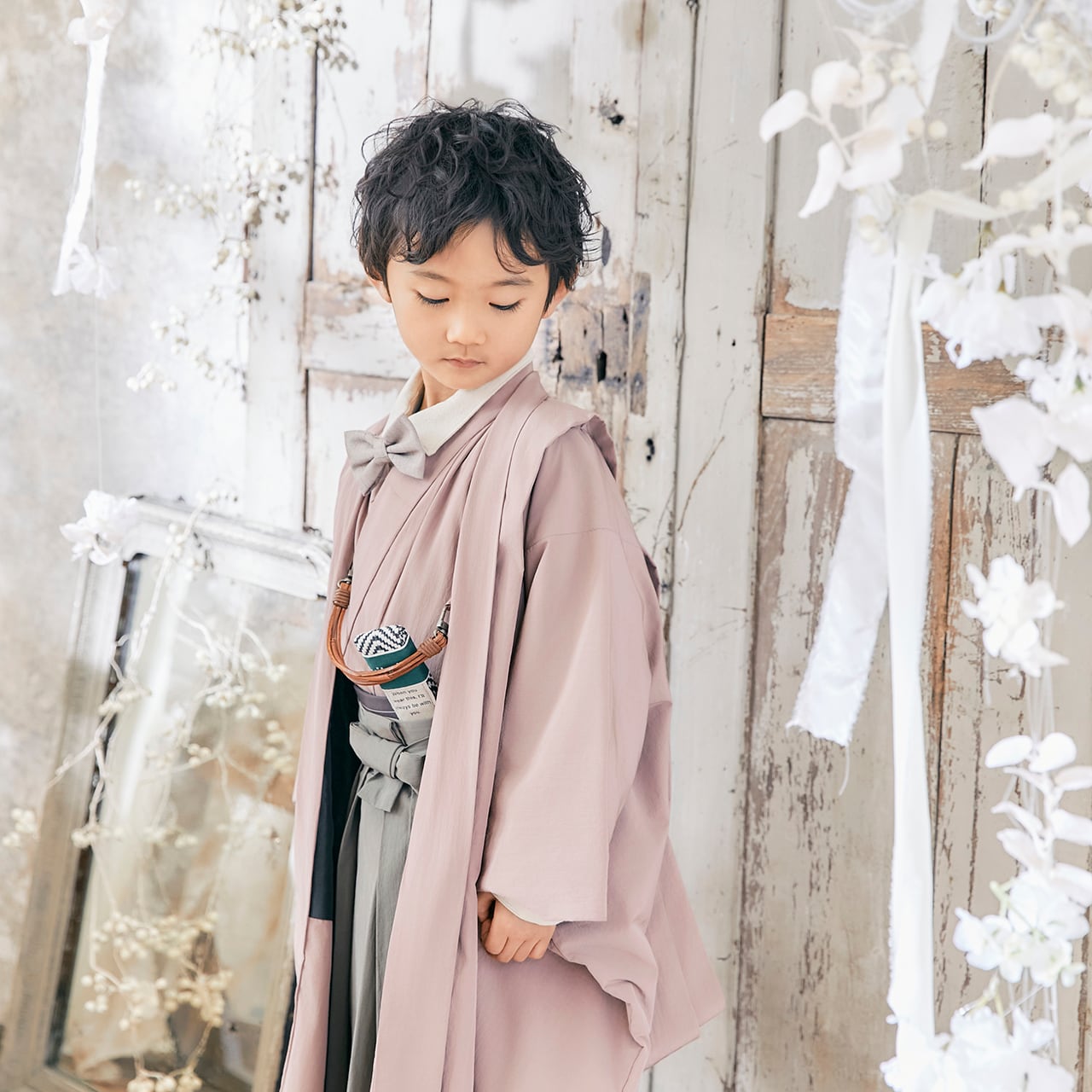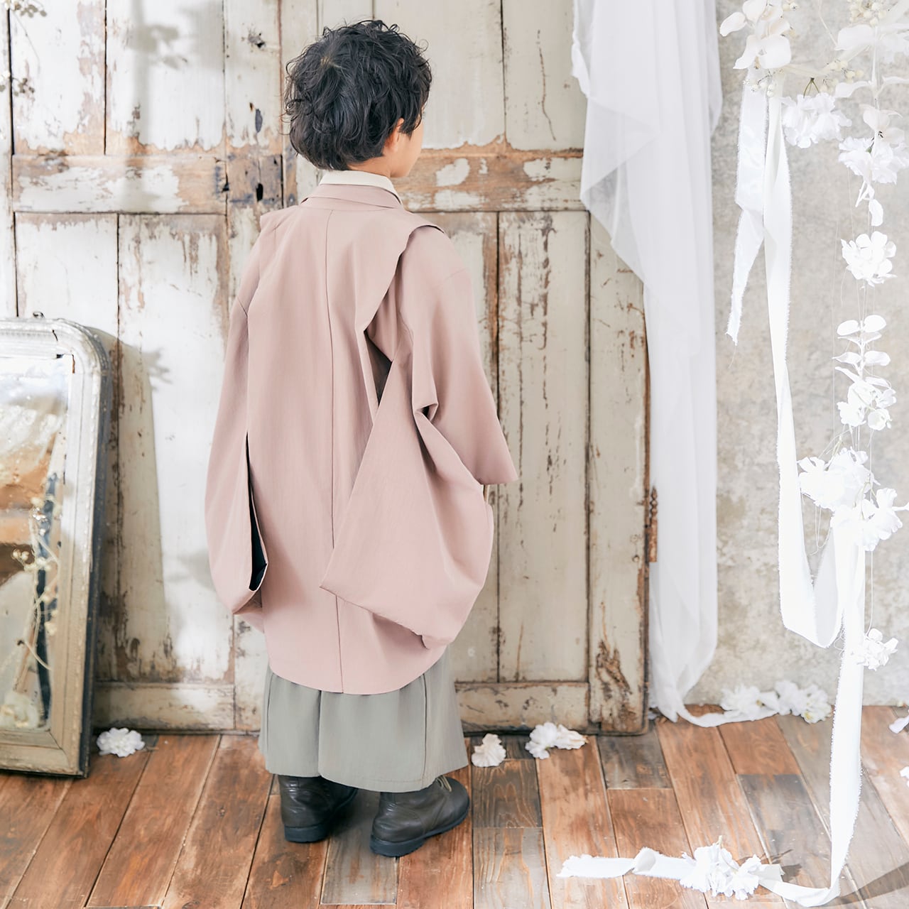 羽織と長着はワークテイストな生地感にこだわり、スモーキーピンクなニュアンスカラーで無地きものを仕立てました。