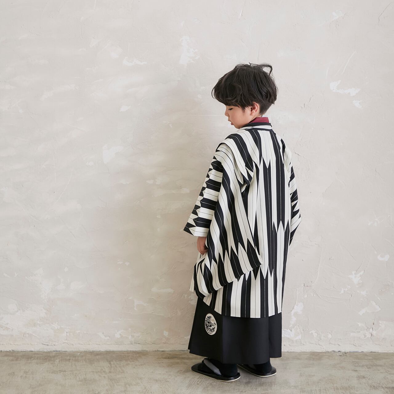 白地に黒の矢絣模様の羽織に深みのあるボルドーの長着が落ち着いた上品さを演出します。