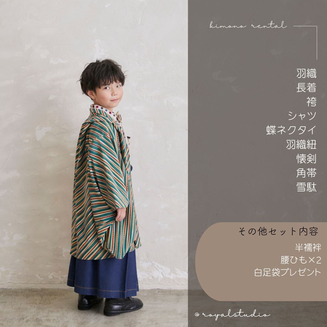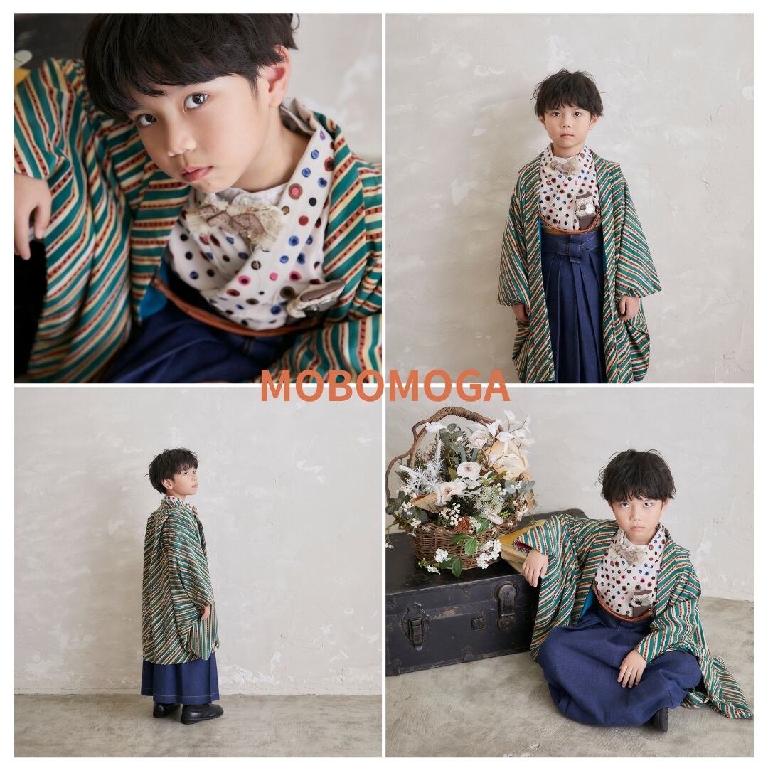 手書き風なドット柄の長着と、羽織にはグリーンや赤や白の縞模様が入った個性的なレトロモダン柄のきものです。