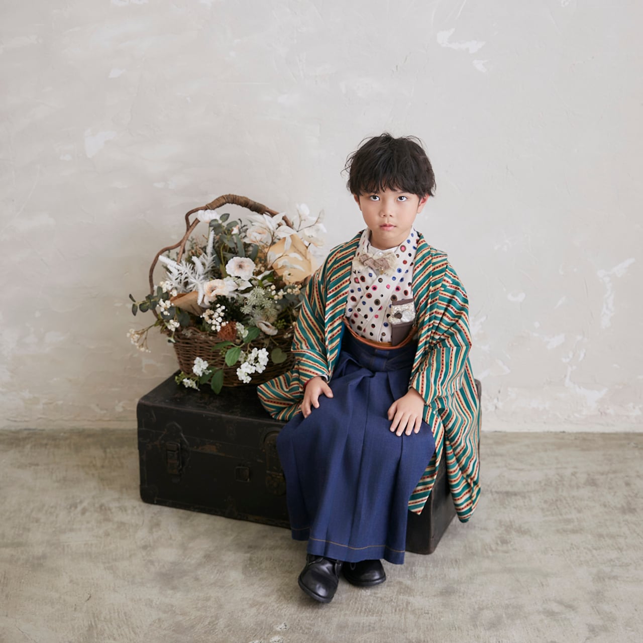 ベージュシャツ×チョウタイに、オレンジのステッチが効いたデニム袴でレトロポップであり、ワークテイストも感じられるようなモダン着物をお楽しみください。