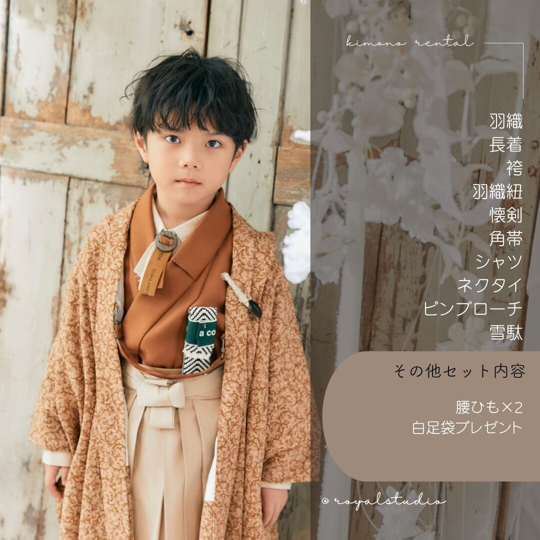 キャメルブラウンの長着にベージュシャツ+ループタイ風のタイ。
